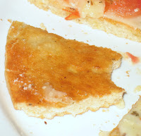 But what was more important to me was that this showed that the sauce and cheese had adhered well to the crust. The top layer of the crust, in other words, was stuck to the sauce and cheese. That's good, as far as I'm concerned, since it means that this was not simply a crust with cheese and sauce lying on top of it, but a unitary whole - crust, sauce and cheese fused together. As long as the crust doesn't get gummy from the liquid in the sauce (which this wasn't), I consider that a good thing.